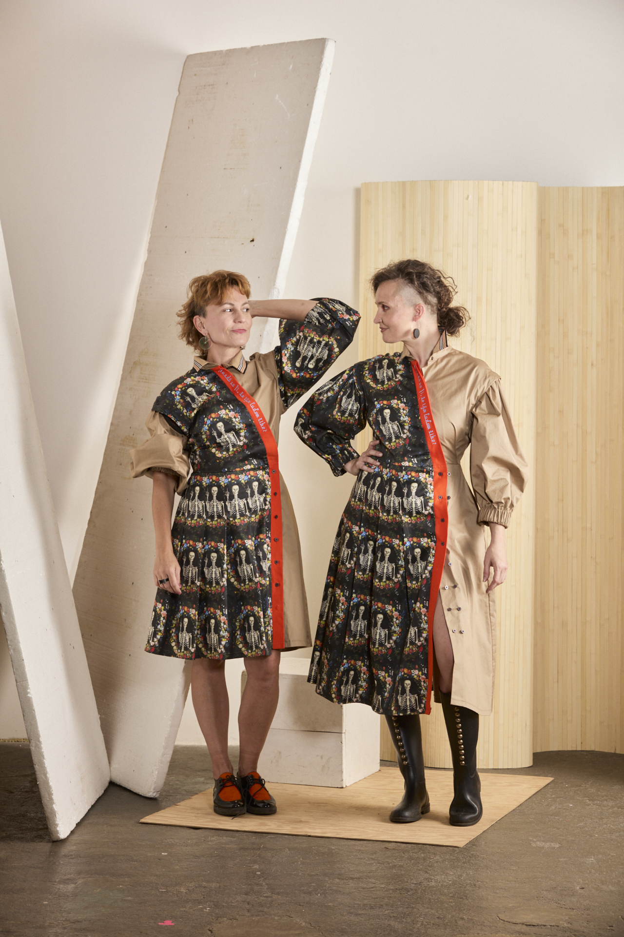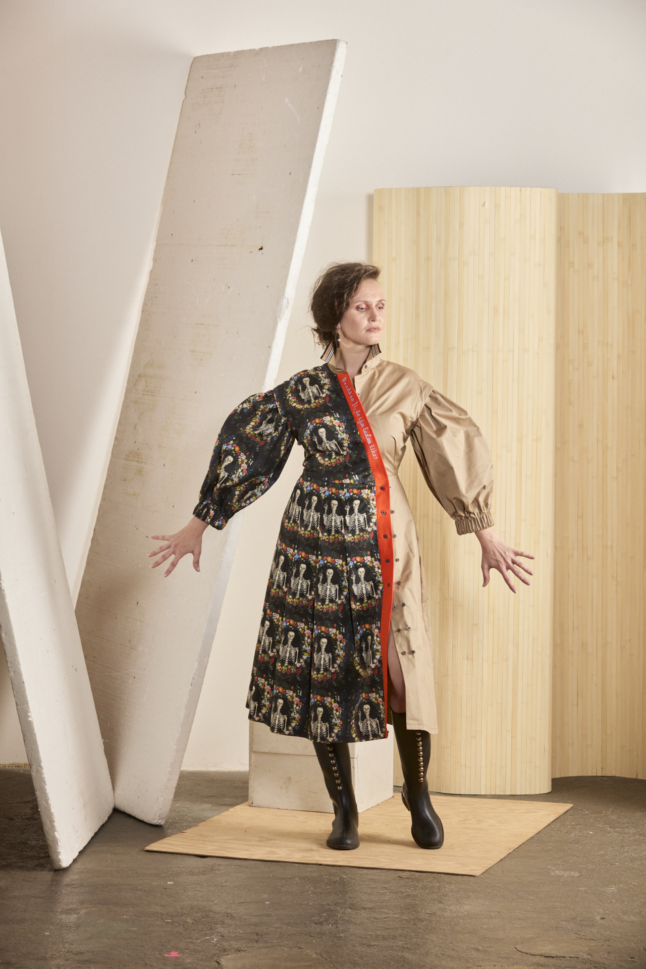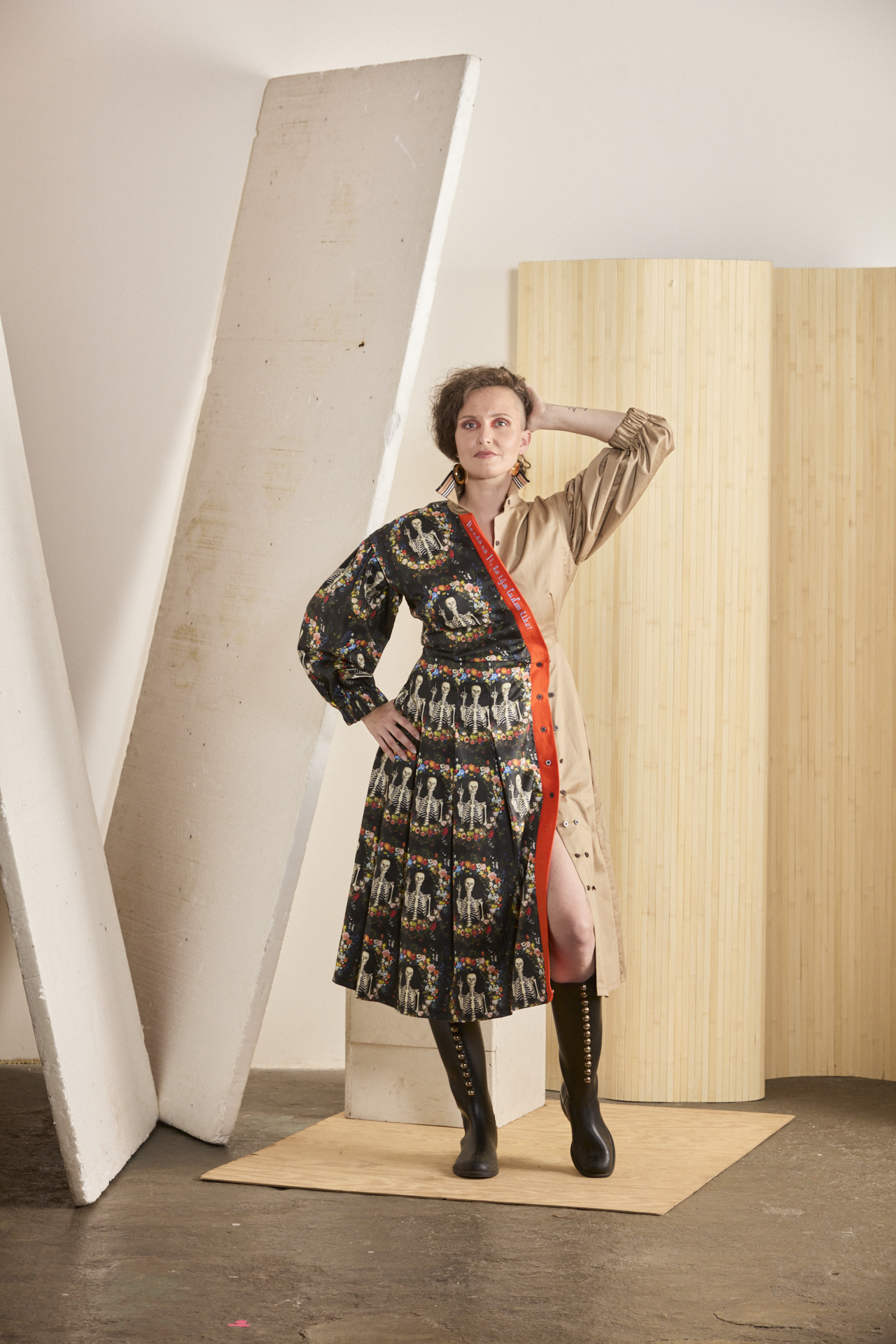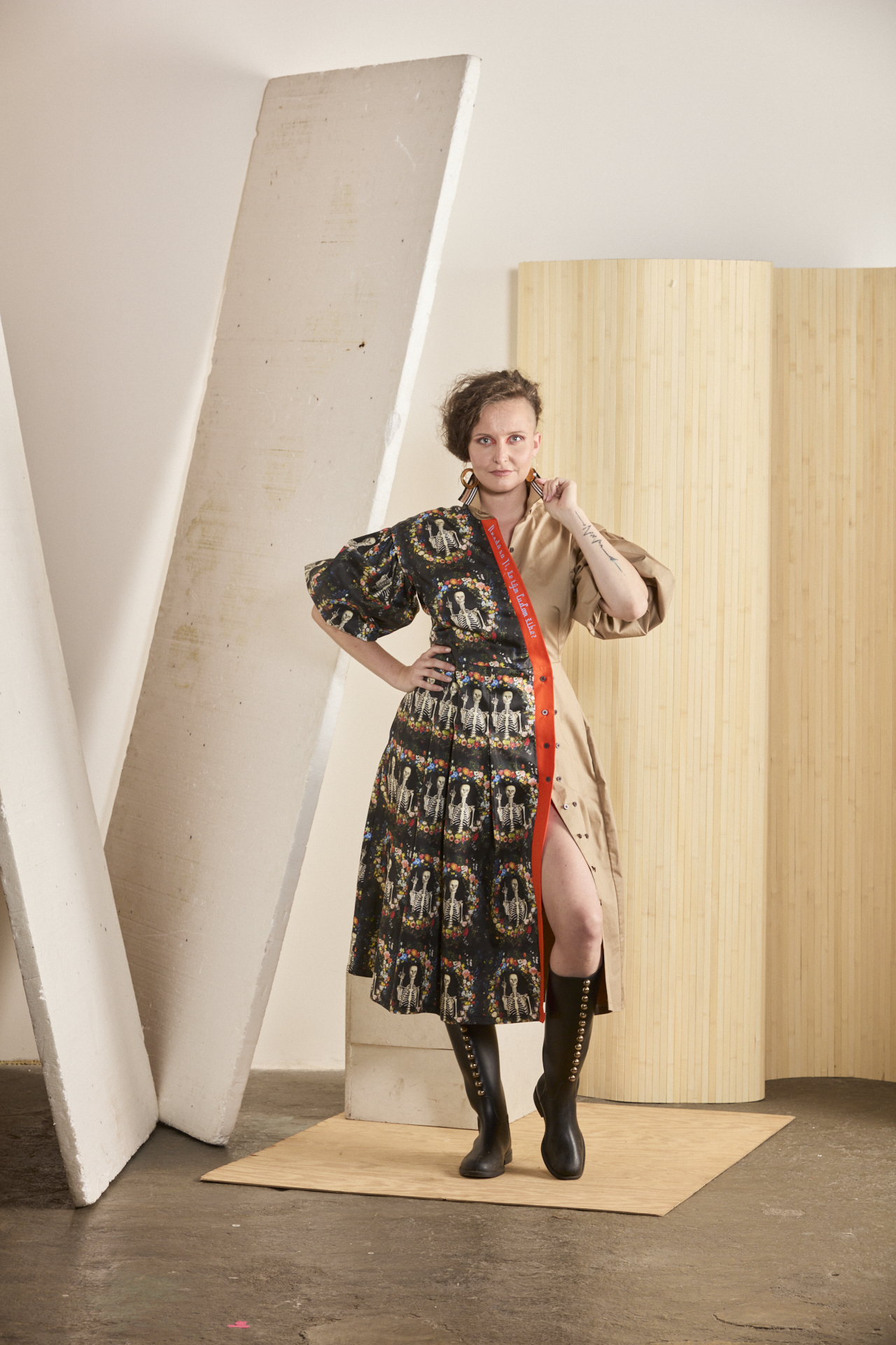 Multifunkční a variabilní šaty z biomateriálu s mimořádně vtipným potiskem. U tohoto modelu je důmyslně propracovaný každý kousíček po kousíčku, aby Vás ani nitka nenechala chladnou. Souhra dvou materiálů – avantgardního biobavlněného saténu od amerických spoonflower.com s potiskem kostřiček se vztyčeným prostředníčkem a biobavlněným saténem v béžové barvě. A to je jen základ propracovaného střihu s variabilitou. Ta se nachází v odepínacích rukávech, díky kterým vzniká model pro nošení 365 dní v roce a vůbec se nebojte rukávy prohodit – tím vznikne ještě o fous zajímavější verze těchto šatů. Dvouřadé košilové zapínání na sukni umožňuje změnu velikosti. Naskládaná sukně s kapsami udává dynamiku modelu a je v symbióze s nabíranými rukávy staženými do gumy, díky které se rukávy odlehčí na 3/4 délku s balónovým efektem. Kontrastní oranžová lišta s výšivkou “Nezdá sa Ti, že tým ľuďom šibe?” spojuje celou koláž a dodává vtip, ale i zamyšlení nad použitým potiskem. …protože se nám opravdu zdá, že občas tým ľuďomm šibe, a to pořádně.
