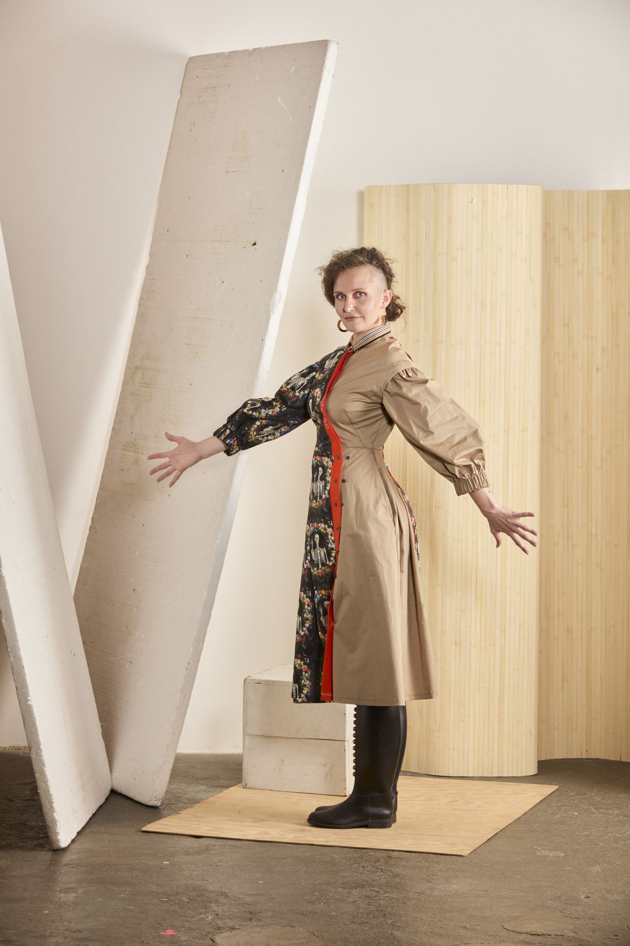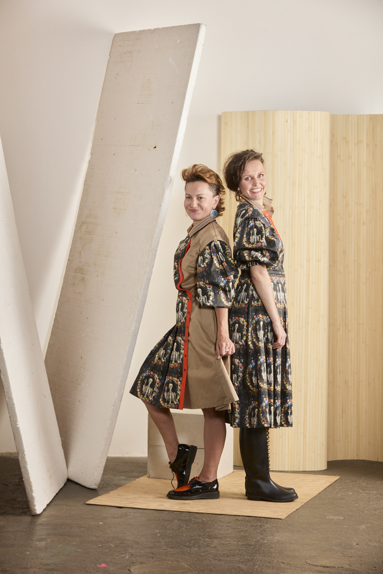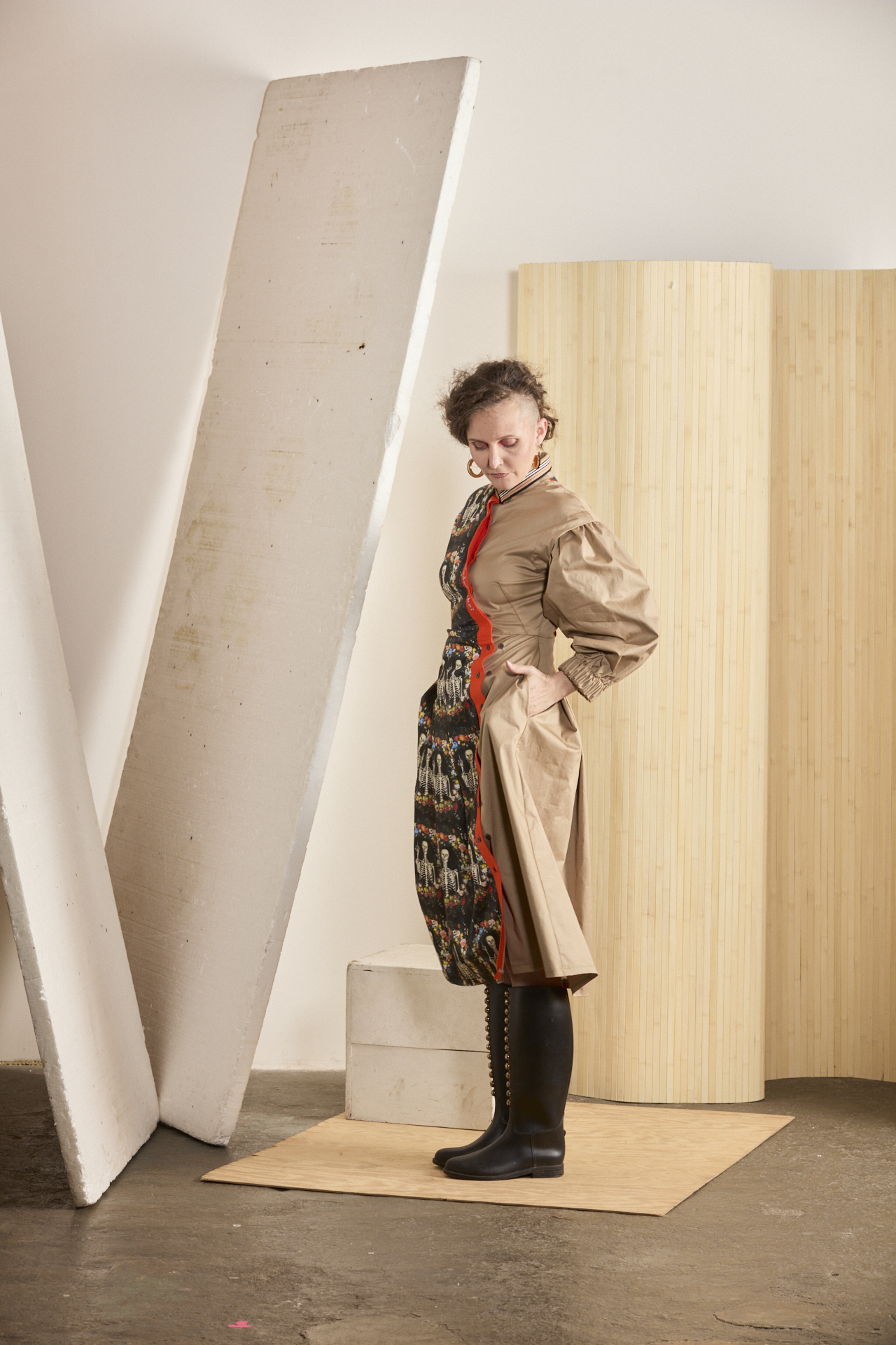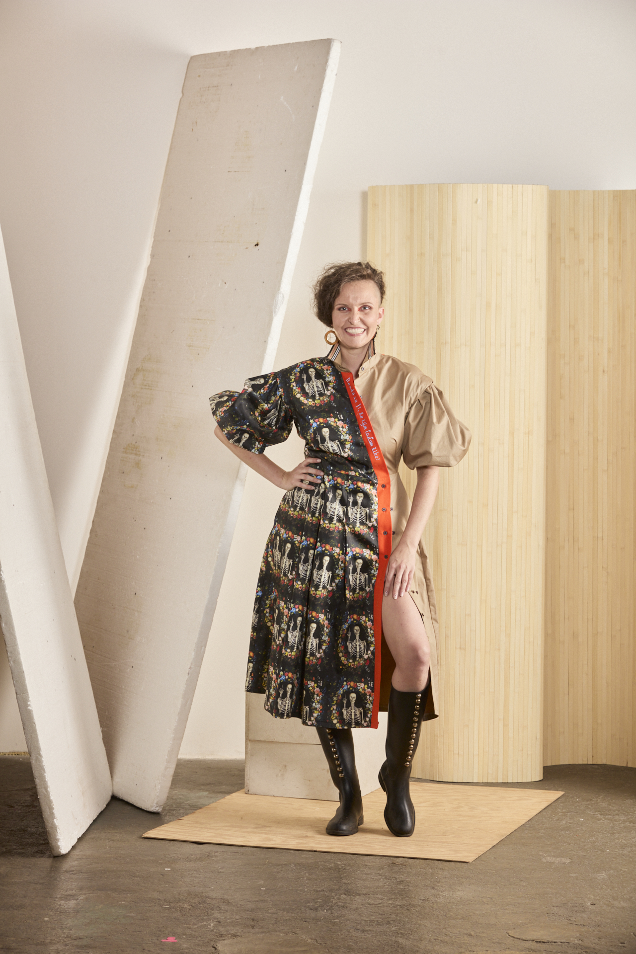 Multifunkční a variabilní šaty z biomateriálu s mimořádně vtipným potiskem. U tohoto modelu je důmyslně propracovaný každý kousíček po kousíčku, aby Vás ani nitka nenechala chladnou. Souhra dvou materiálů – avantgardního biobavlněného saténu od amerických spoonflower.com s potiskem kostřiček se vztyčeným prostředníčkem a biobavlněným saténem v béžové barvě. A to je jen základ propracovaného střihu s variabilitou. Ta se nachází v odepínacích rukávech, díky kterým vzniká model pro nošení 365 dní v roce a vůbec se nebojte rukávy prohodit – tím vznikne ještě o fous zajímavější verze těchto šatů. Dvouřadé košilové zapínání na sukni umožňuje změnu velikosti. Naskládaná sukně s kapsami udává dynamiku modelu a je v symbióze s nabíranými rukávy staženými do gumy, díky které se rukávy odlehčí na 3/4 délku s balónovým efektem. Kontrastní oranžová lišta s výšivkou “Nezdá sa Ti, že tým ľuďom šibe?” spojuje celou koláž a dodává vtip, ale i zamyšlení nad použitým potiskem. …protože se nám opravdu zdá, že občas tým ľuďomm šibe, a to pořádně.